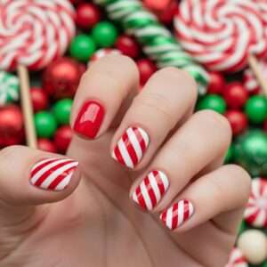 For smaller nails, you can simplify the pattern by painting just one accent candy cane nail and leaving the rest solid red or white.