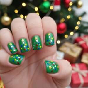Use a green polish for the tree and decorate it with colorful dots for ornaments.