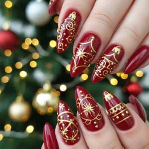 The metallic finish reflects light beautifully, making your nails look like shiny Christmas ornaments.