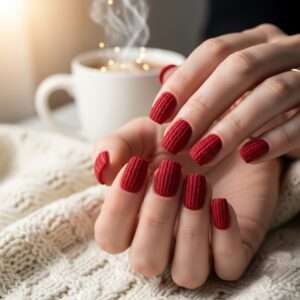 Bring cozy winter charm to your manicure with a red sweater nail design.