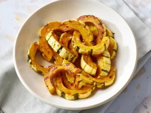 Delicata squash has a naturally sweet, nutty flavor and creamy texture that pairs beautifully with warm spices and a drizzle of olive oil.