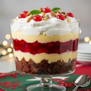 Layers of spiced fruitcake, creamy custard, whipped cream, and juicy fruits create a dessert that’s rich, festive, and easy to serve.