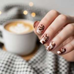 Inspired by your favorite coffee drinks, mocha swirl nails blend shades of brown, beige, and white for a deliciously stylish look.