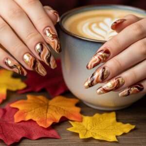 Add a luxurious twist with a marble nail design using shades of caramel, brown, and nude.