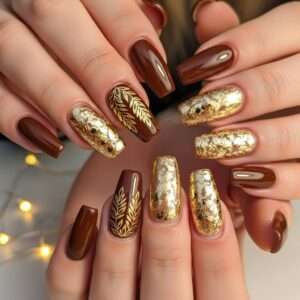 Combine warm chocolate brown polish with shimmering gold accents for a look that screams sophistication.