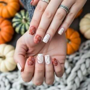 A rust and cream color palette creates a soft, balanced fall manicure.