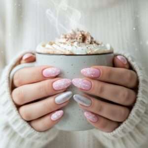 Start with a pastel or baby pink base, then add delicate white snowflakes and silver glitter for that icy sparkle.