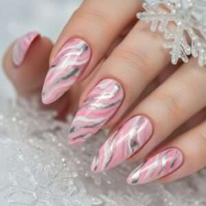 Create a cool, frosted marble effect with pink, white, and silver polish.