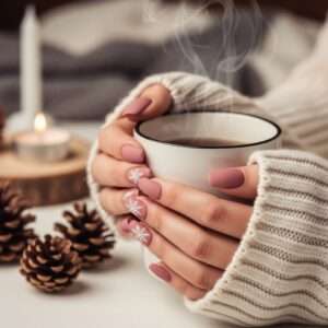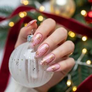 Combine pink polish with tiny gold snowflake decals for a warm and elegant Christmas feel.