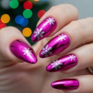 A sleek metallic pink base with shiny silver snowflakes creates a futuristic yet festive look.