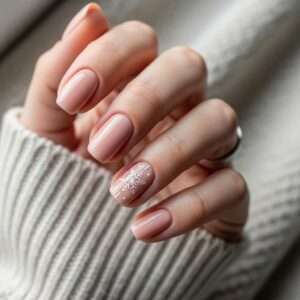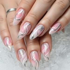Start with a light pink base and fade in silver or rose glitter from the tips down.