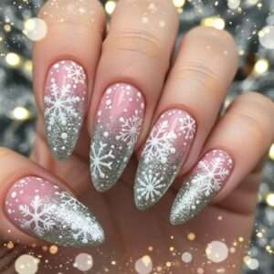 10. Glitter Gradient Pink Snowflake Nails