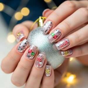 Accent one or two nails with mini designs like ornaments, reindeer, or bows for that holiday charm.