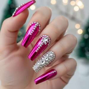 Bold, confident, and full of attitude — hot pink nails with rhinestones or metallic accents make a strong holiday statement.
