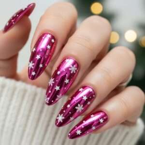 Metallic pink chrome nails reflect light beautifully — like wrapping paper on Christmas morning.
