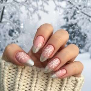 Soft blush pink nails with delicate white snowflakes create a cozy winter feel.