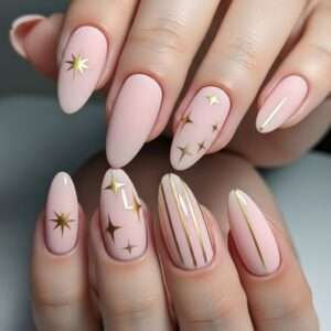 Try a matte baby pink base with thin gold lines, stars, or tree designs for a sophisticated Christmas touch.