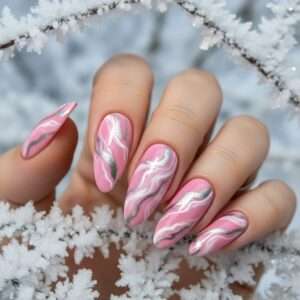 For a unique and artsy manicure, go for marble-style pink nails with streaks of white and silver.