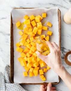 Spread the cubed squash on a baking sheet lined with parchment paper.