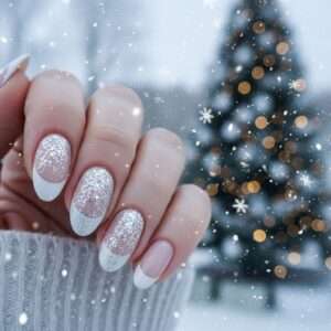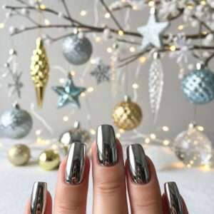 They’re sleek, futuristic, and reflect Christmas lights beautifully. Keep them short and neat for a minimalist but glamorous effect.