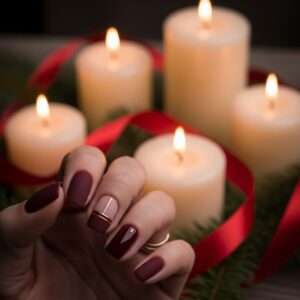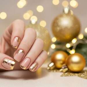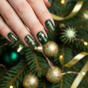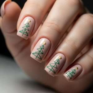 Paint your nails nude or cream, then draw tiny green holly leaves with red berry dots on one accent nail. It’s simple art that feels perfectly festive.
