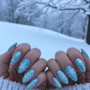 Use a soft blue polish and top it off with fine silver glitter or snowflake decals.