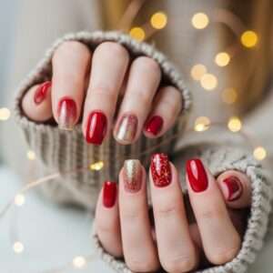 Add a single accent nail with gold glitter to make it pop — timeless, festive, and easy to do.