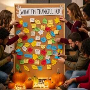 Set up a corkboard or poster where everyone can write what they’re thankful for on sticky notes or paper leaves.