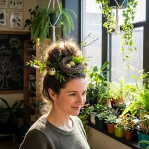 Twist your hair into a messy bun, then weave in small twigs, leaves, and even tiny fake birds or eggs.